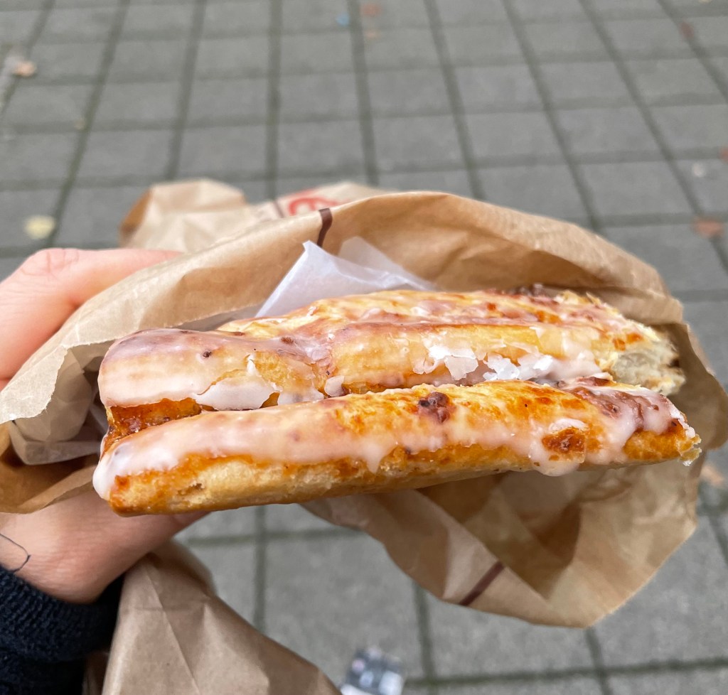 Um unsere Nerven zu besänftigen, holten wir uns beim Bäcker eine Wegzehrung. Bereits gestern lächelte mich ein Walnussplunder an. Heute kaufte ich es mir. L bekam einen Laugenzopf.