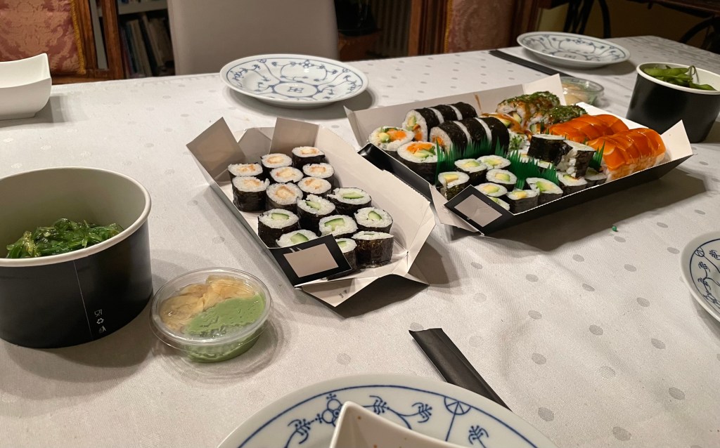 Zum Frühstück aß ich ein Croissant mit Frischkäse und Ei, dazu gab es eine Tasse Schokocappuccino. Mittags wurden mit Spinat gefüllte Tortellini und Spinat serviert, zum Vesper probierte ich Cs Rhabarberkuchen und abends wurde Sushi bestellt.