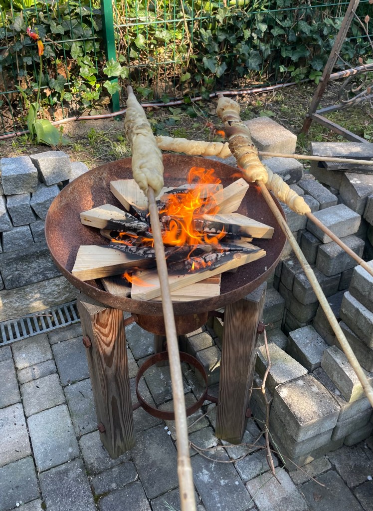 Halb fünf am Nachmittag waren wir zurück in EBs Zuhause. Leipzig-A zündete die Feuerschale an, über der wir zuerst Stockbrot und später Marshmallows grillten.