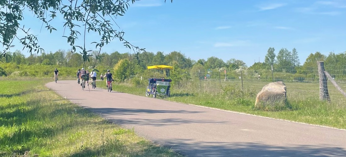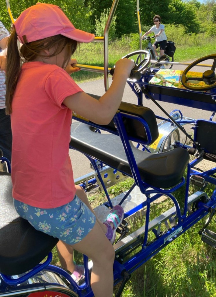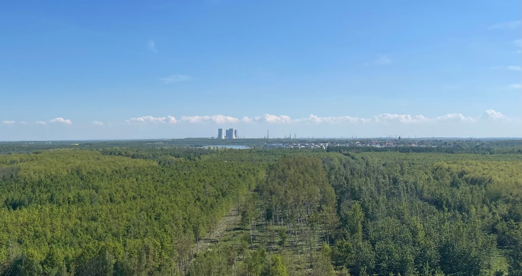 Kurz darauf war es bereits Zeit, zum Cospudener See aufzubrechen. Die Parkplätze waren maßlos überfüllt. Wir hatten allerdings Glück und fanden ganz in der Nähe im Anwohnerbereich eine kostenlose Parkmöglichkeit. Gegen vierzehn Uhr starteten wir unsere Runde um den Cossi mit unserem zuvor gemieteten 4er Tretmobil und einer Snacktüte. Eine erste Pause machten wir bei der Bistumshöhe, von der aus ein wunderschöner Ausblick genossen werden kann, wenn man zuvor die einhundertachtzig Stufen bewältigt. Dass es einen Imbissstand gibt, wusste ich nicht. Umso schöner war es, dass L und ich uns dort einen Crêpe holen konnten. Eine zweite Pause machten wir gegen Ende unserer Fahrt. Wir tauchten unsere Füße in den See. Mir war das Wasser noch viel zu kalt zum Baden. Ich bewunderte somit alle Leute, die heute mutig genug waren, komplett unterzutauchen.