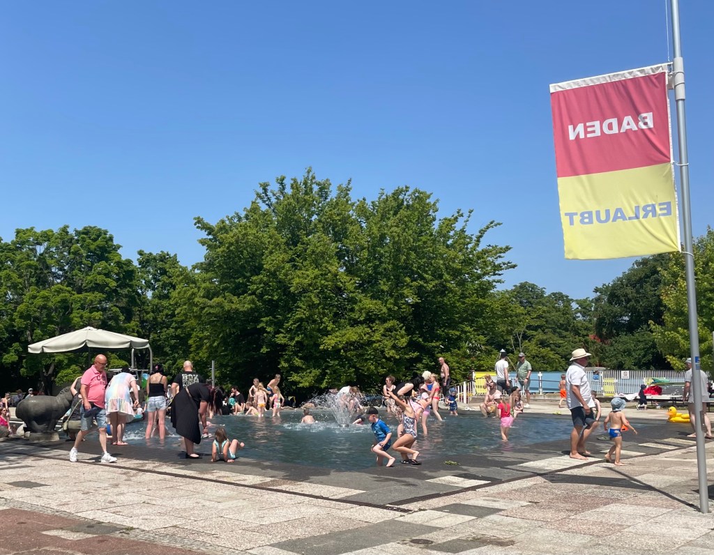 Wir fuhren alle gemeinsam mit der Tram zum Egapark. Dort verbrachten wir über drei Stunden bei bestem Sommerwetter. Wir fanden mit sehr viel Glück noch ein schattiges Plätzchen für unser mitgebrachtes Picknick. Während sich die Erwachsenen unterhielten und über verschiedene Themen austauschten, konnten sich die beiden Kinder im Badebereich abkühlen und auf den Spielplätzen austoben. L hat sich sehr rührend um den kleinen F gekümmert.