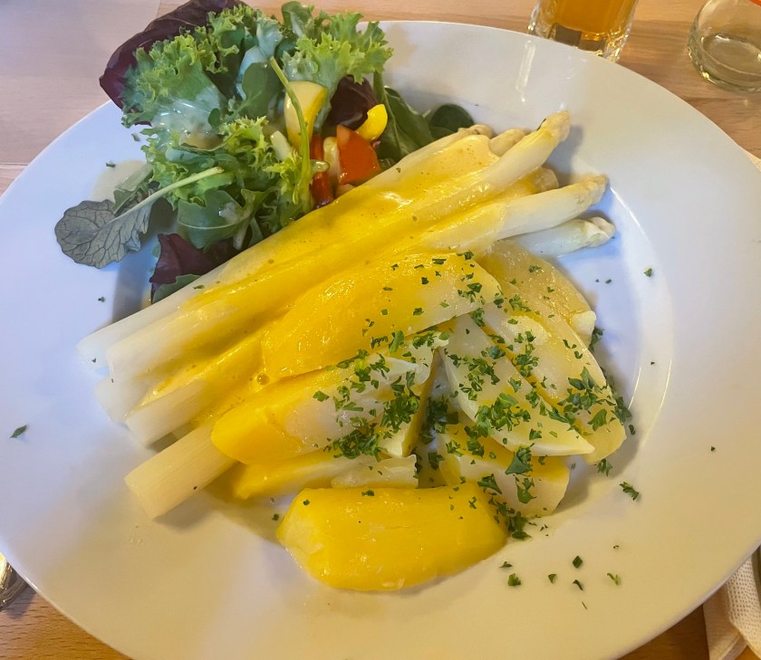 Zu Abend gegessen wurde im Restaurant „Zum Güldenen Rade“. Wir saßen im Innenbereich, der aufgrund seiner dicken Gemäuer angenehm kühl war. Für mich gab es ein leckeres Spargelgericht.