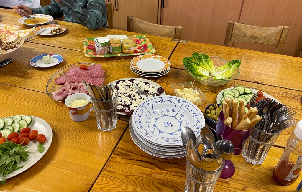 Gefrühstückt habe ich etwas knuspriges Schokomüsli mit Himbeeren, Weintrauben und Birnenstücken. Am Nachmittag aß ich leckeren Kuchen und abends wurde ein großes Buffet aufgebaut.