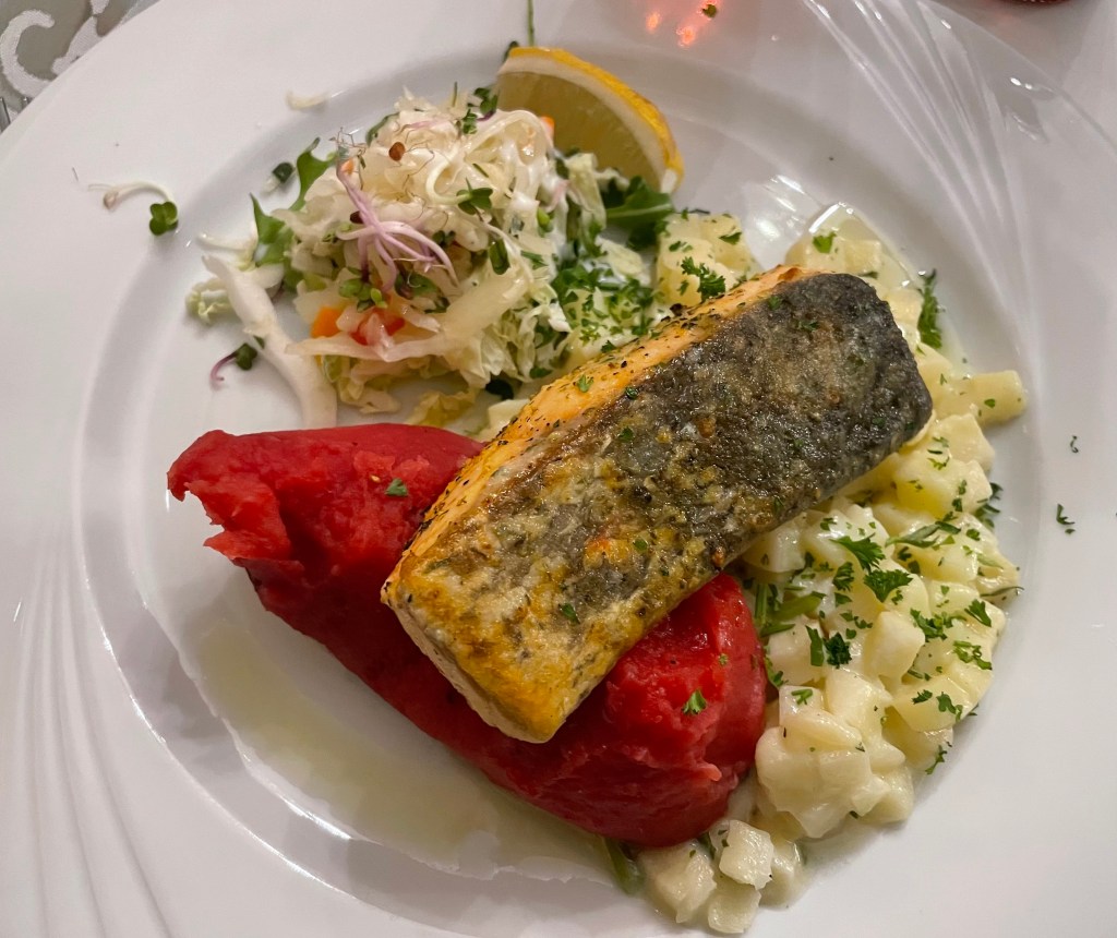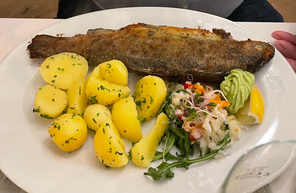 Gefrühstückt habe ich ein Croissant mit Frischkäse, dazu gab es ein gekochtes Ei. Mittags ließen wir uns die von meiner Mama gekochte Kartoffelsuppe mit Brot schmecken. Abends aß ich Rote-Bete-Kartoffelbrei, Petersilienwurzelgemüse und ein Lachsfilet. Die Hälfte von Ls Nachtisch wanderte wenig später auch in meinen Magen.