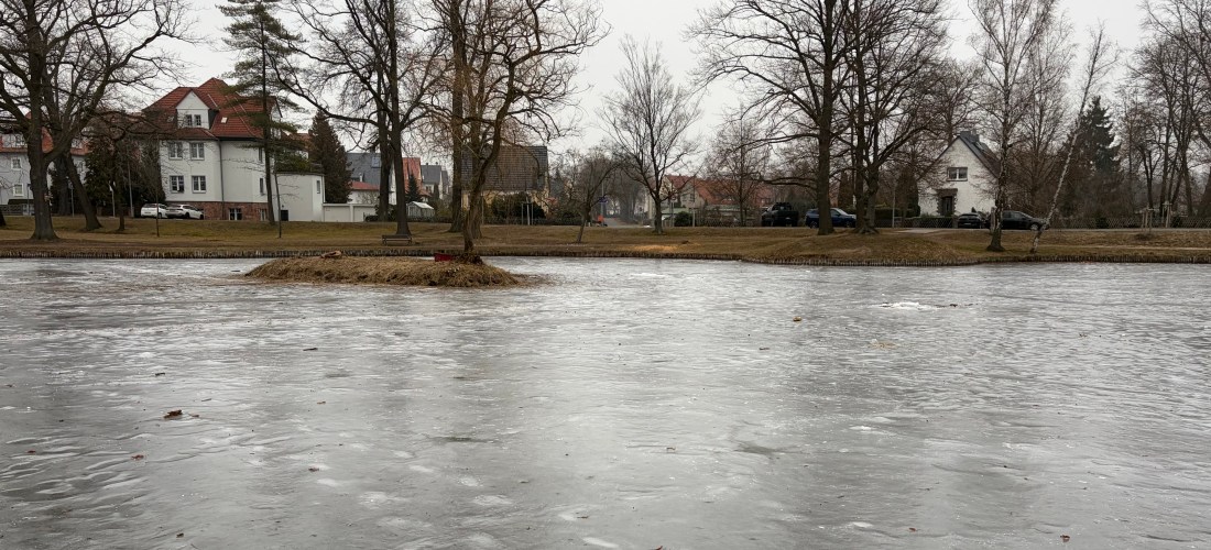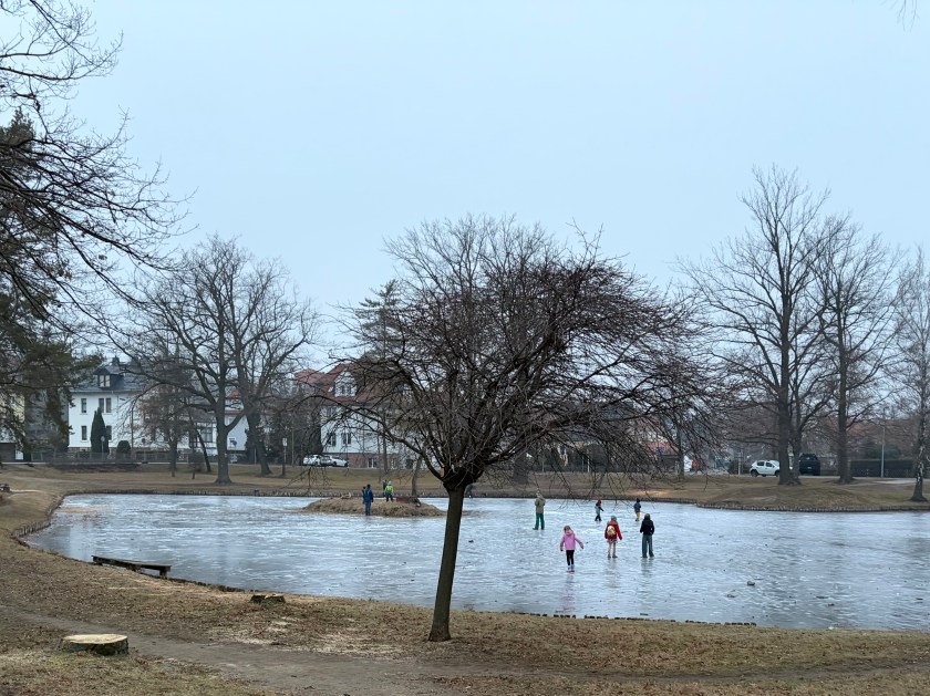 Nach unserer Ankunft und vor der Rückfahrt schlitterten die drei Mädels über den zugefrorenen Teich, entdeckten darin allerlei Müll und hatten absolut keine Angst einzustürzen.