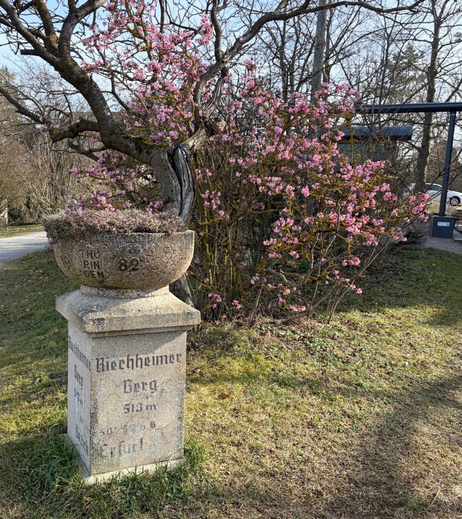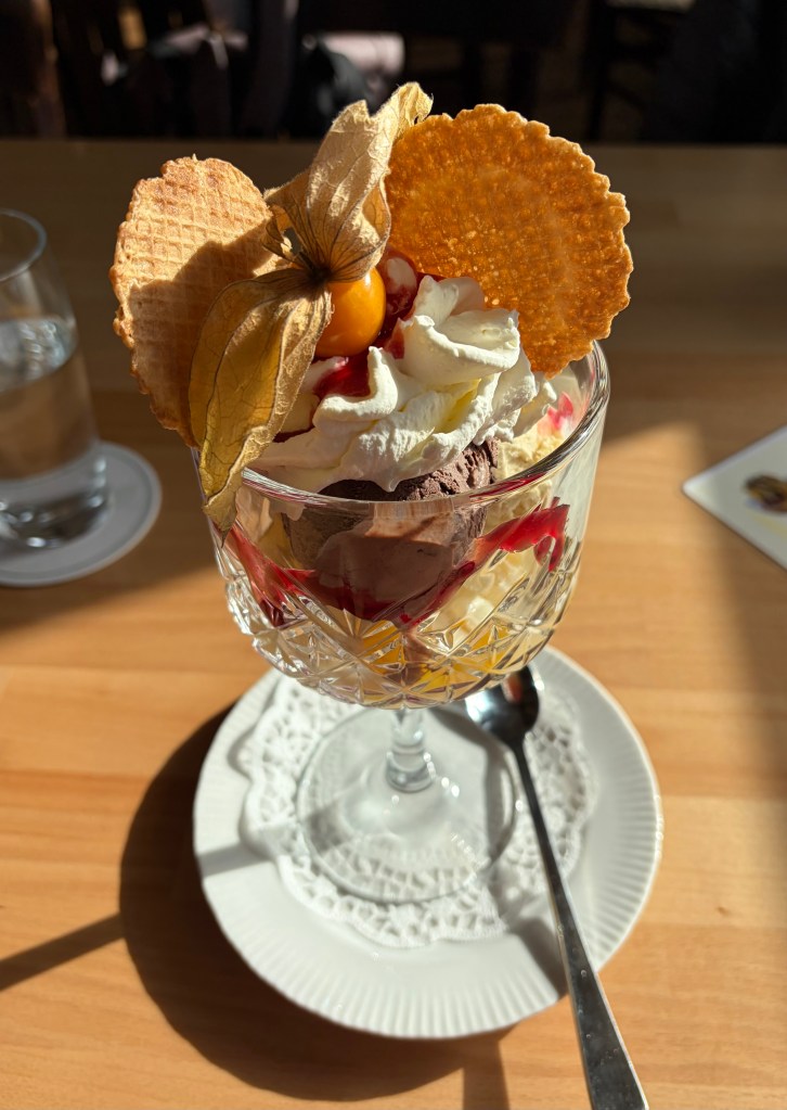 Dort aßen wir gemeinsam Mittag, hörten Ls Freizeitparkpläne in Endlosschleife und fuhren danach zum Riechheimer Berg. Wir kehrten am frühen Nachmittag nach einem Spaziergang und kurzem Sonnenbad im Liegestuhl in die Gaststätte ein. Jede aß einen Eisbecher und bestellte sich ein Getränk. L futterte zudem auch ein Stück Kuchen.
