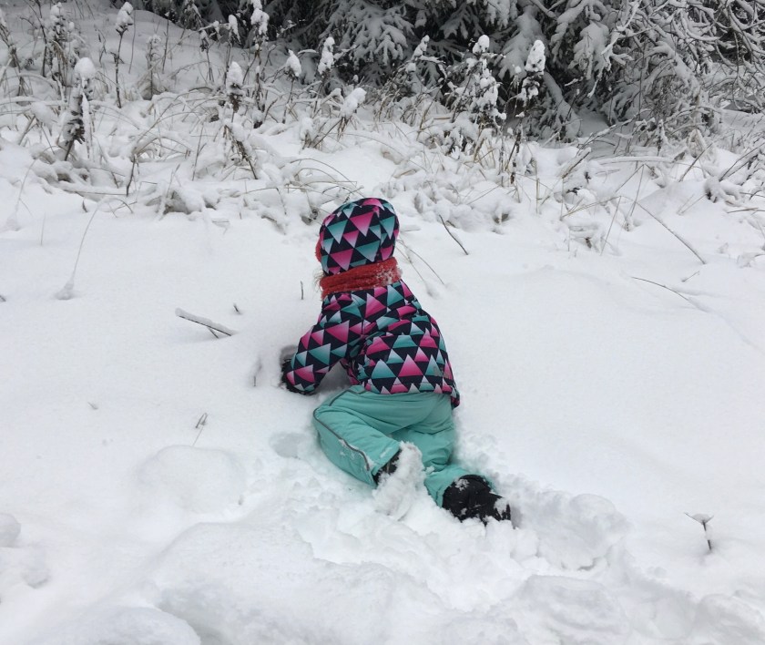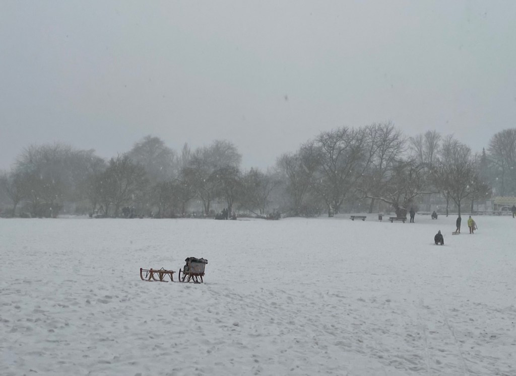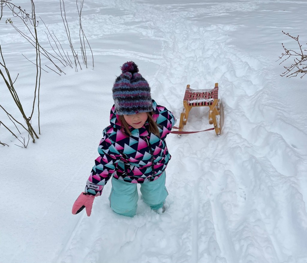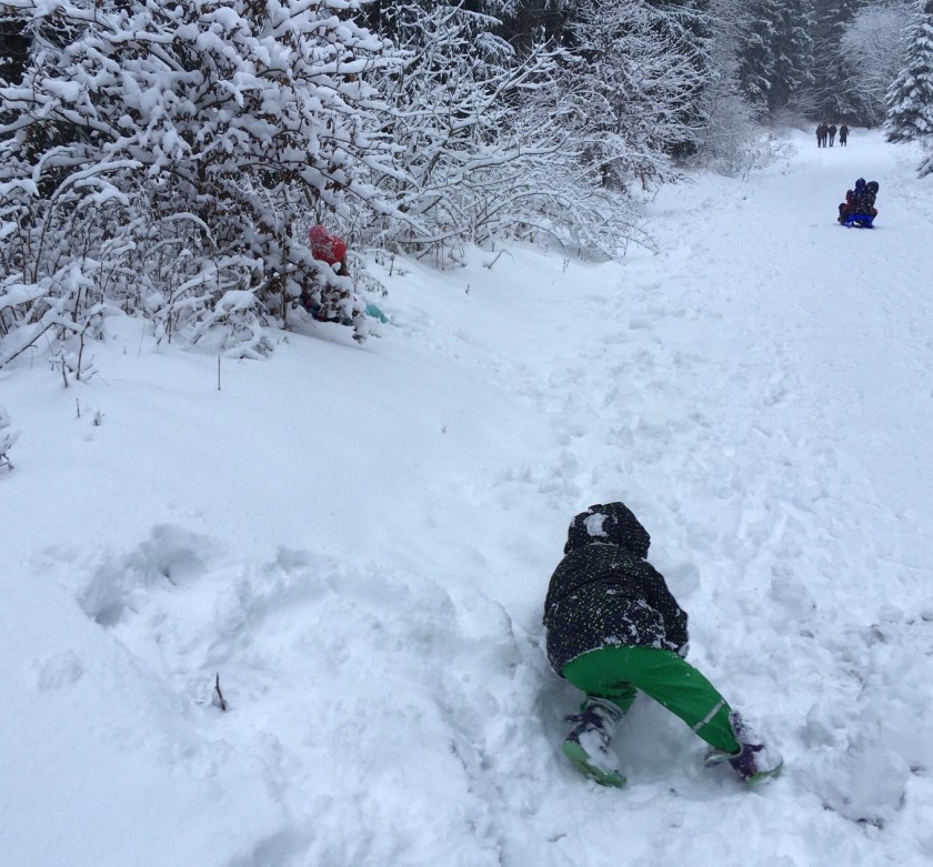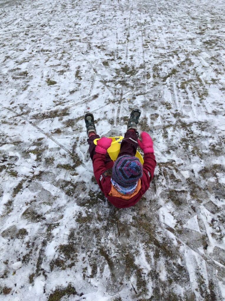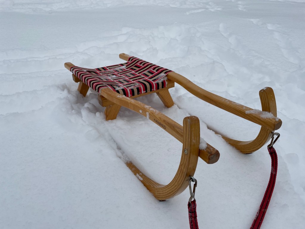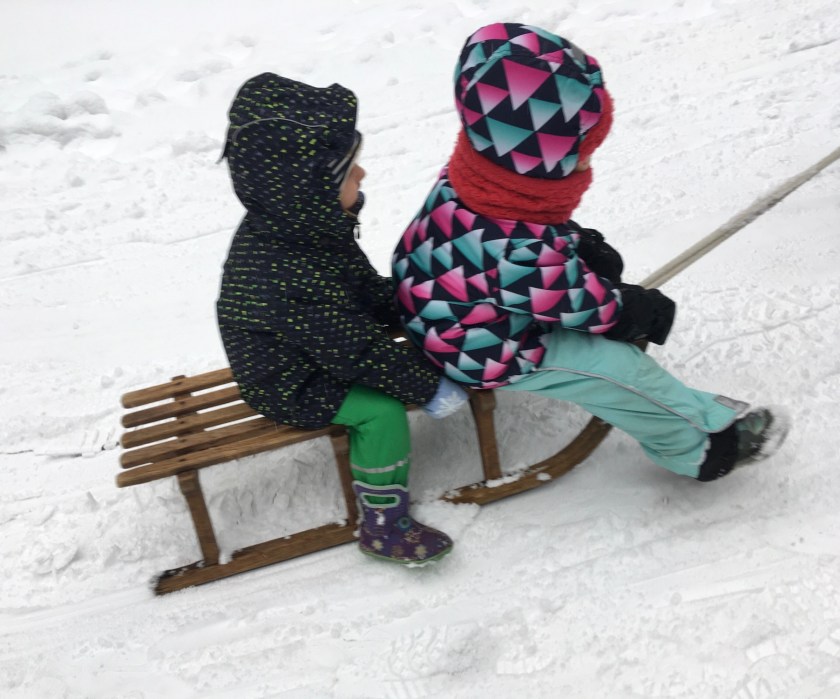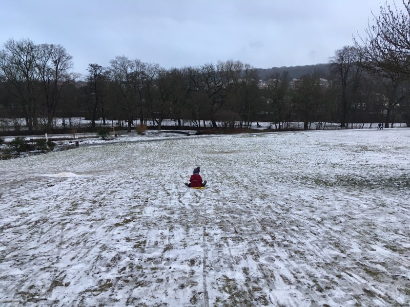 Der Schneefall nahm gegen Abend zu. Es schneite die ganze Nacht hindurch. L und ich nutzten den Sonntag Nachmittag zum Rodeln. Wir brachten nach wenigen Minuten unseren Poporutscher zurück nach Hause, denn mit diesem kamen wir kaum vorwärts, und holten stattdessen den Schlitten. Es lag genau die richtige Menge Schnee, um sehr schnell und sehr weit rodeln zu können. ❤