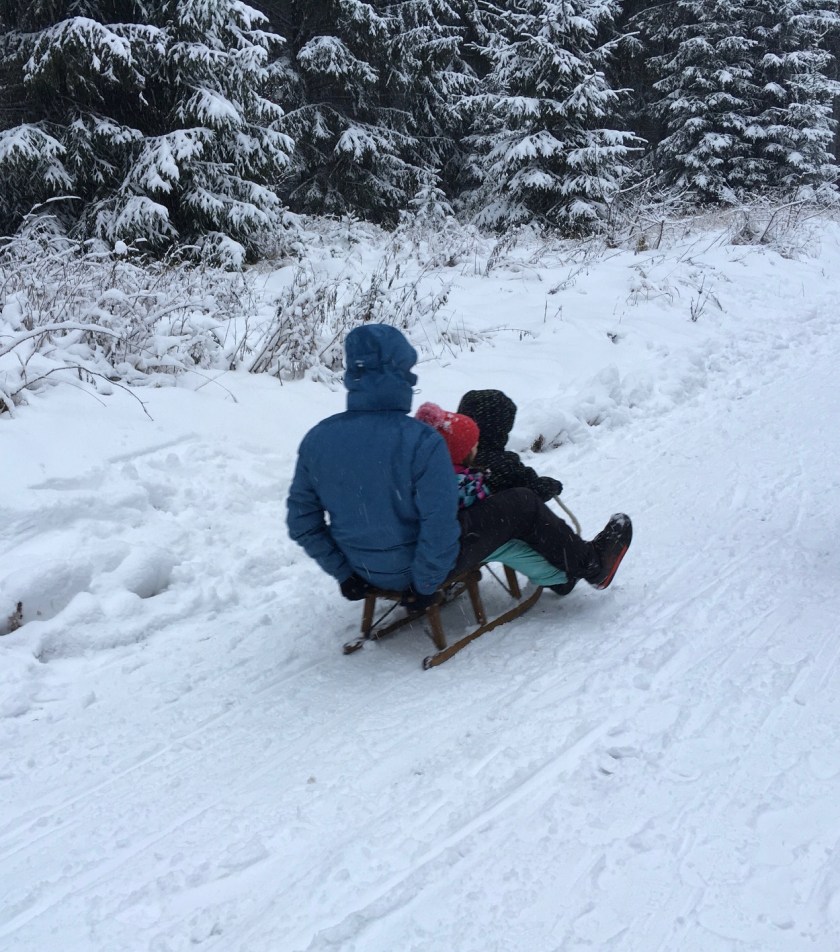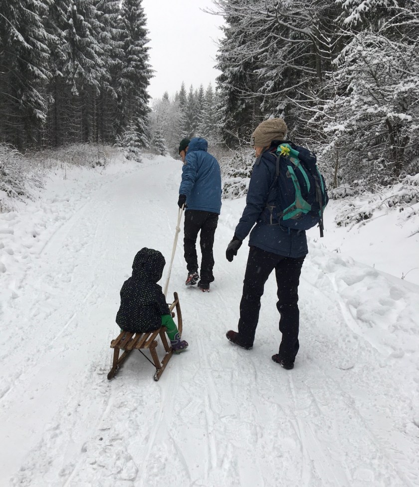 Mit U, E, K und L im Gepäck fuhren wir heute Mittag in Richtung Frauenwald. Kurz hinter Ilmenau hielten wir jedoch schon auf einem überfüllten Wanderparkplatz, zogen uns warm an und liefen circa dreihundert oder vierhundert Meter bergauf. Dann warfen sich beide Kinder in den Schnee, bewarfen vorrangig mich mit Schneebällen und hatten unglaublich viel Spaß. Wir schauten ihnen eine gute Stunde glücklich frierend dabei zu. Der Schlitten durfte natürlich auch nicht fehlen. 🙂