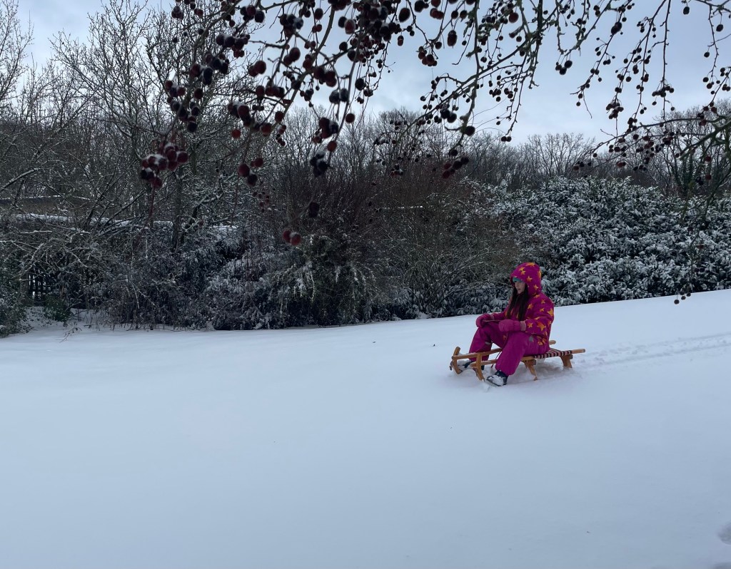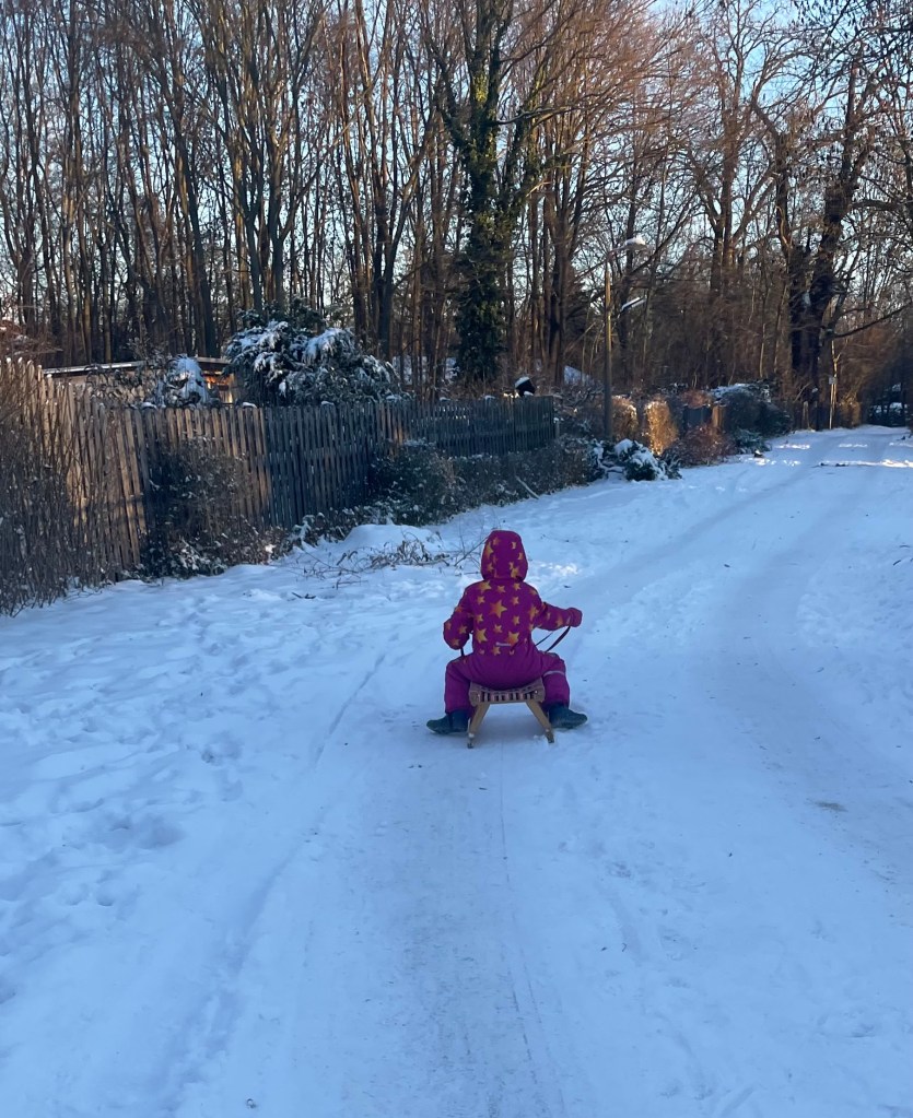 Nach dem späten Frühstück gingen L und ich dick eingemummelt mit unserem Schlitten und einem Popo-Rutscher zum kleinen Hügel hinter dem Wohnkomplex. Gemeinsam rodelten wir und blieben trotz der Kälte und des Windes fast eine Stunde lang draußen.