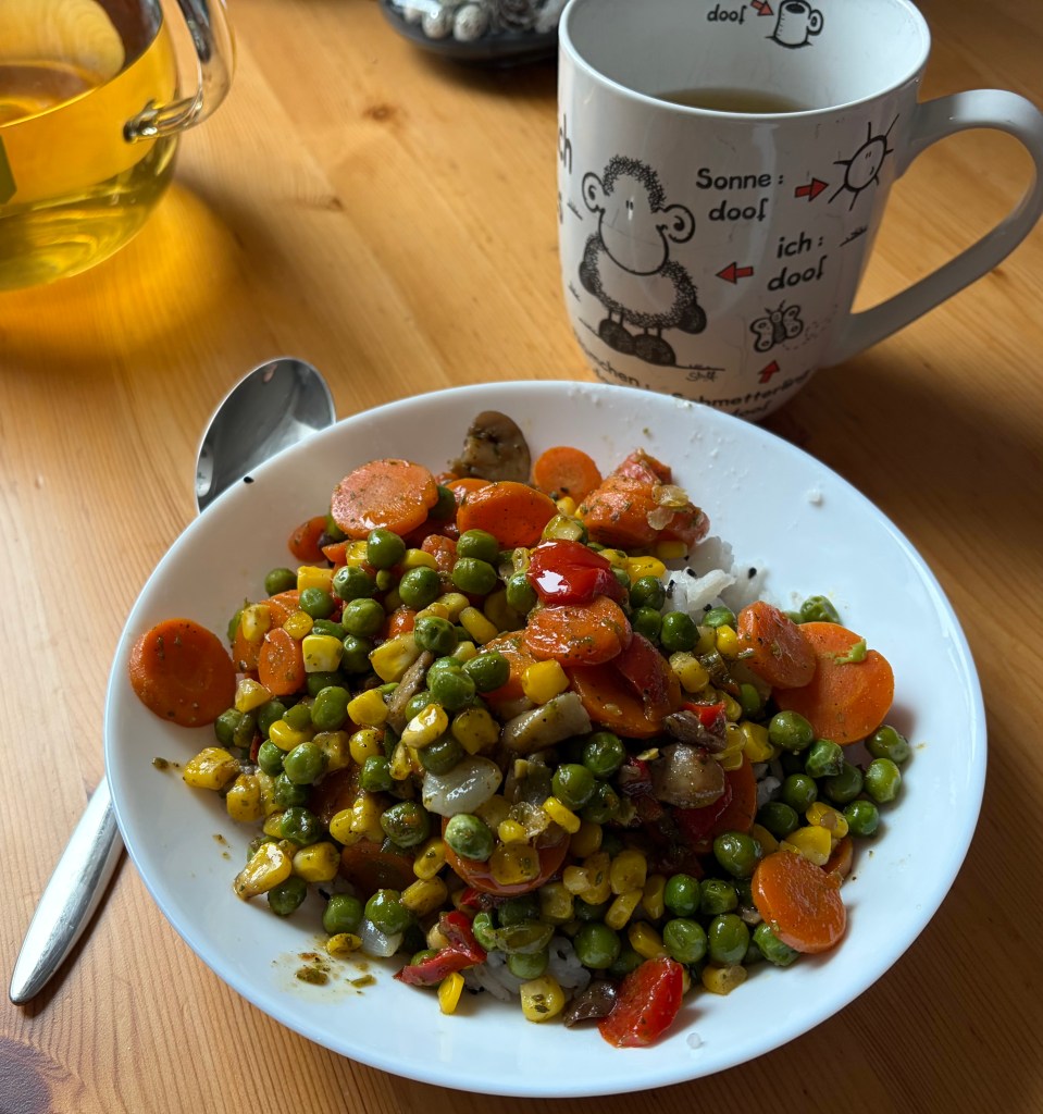 Nach ewigem Hin und Her bereitete ich für L und mich ein zeitiges Mittagessen zu. Es gab Basmati-/Jasminreis mit schwarzem Sesam. Für mich kam eine Gemüsepfanne französischer Art dazu. Während des gemeinsamen Essens in der Küche lauschten wir dem Regen, der vor das Dachfenster trommelte.