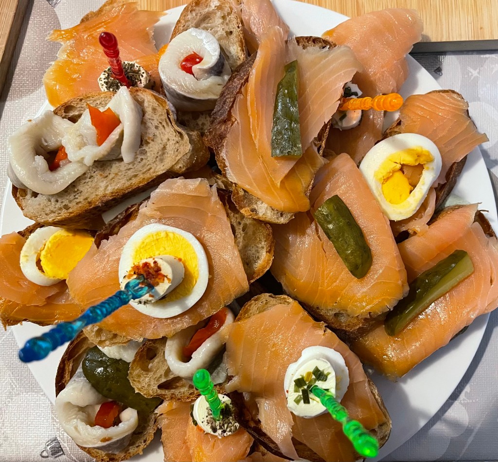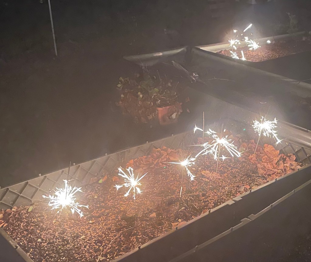 Um achtzehn Uhr kam unser Besuch: mein Onkel J und seine Frau J. Da wir alle die Böllerei verabscheuen (organisiertes Feuerwerk hingegen mögen wir) und L zudem bereits Angst vor dem Lärm hatte, zündeten wir im Hof unsere Wunderkerzen an. Dunkel genug war es bereits. Anschließend stürzten wir uns auf das leckere Abendessen. Es gab Canapés und einen Heringssalat.