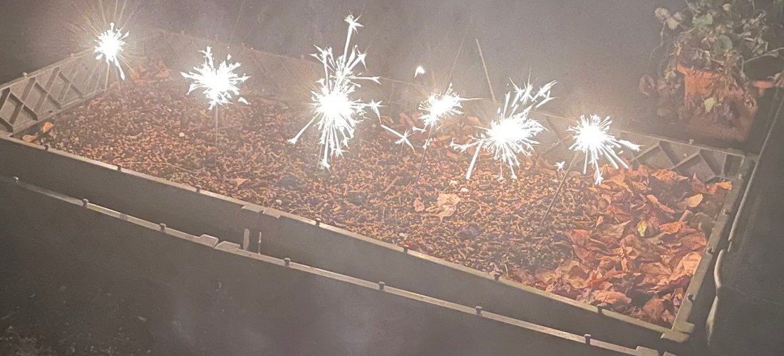 Um achtzehn Uhr kam unser Besuch: mein Onkel J und seine Frau J. Da wir alle die Böllerei verabscheuen (organisiertes Feuerwerk hingegen mögen wir) und L zudem bereits Angst vor dem Lärm hatte, zündeten wir im Hof unsere Wunderkerzen an. Dunkel genug war es bereits. Anschließend stürzten wir uns auf das leckere Abendessen. Es gab Canapés und einen Heringssalat.