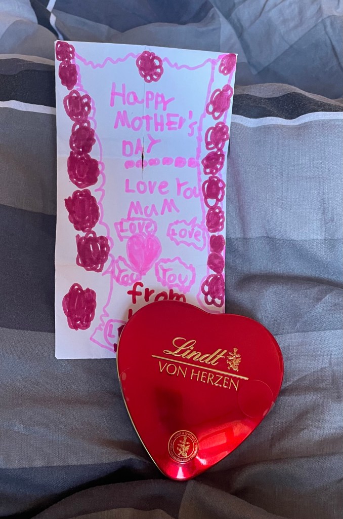 Als L schließlich aufwachte, holte sie direkt ihr Muttertagsgeschenk für mich hervor. Im Englischunterricht gestalteten die Kinder kürzlich eine tolle Karte. Ein kleines Pralinenherz bekam ich von ihr ebenfalls. Danke liebe L!