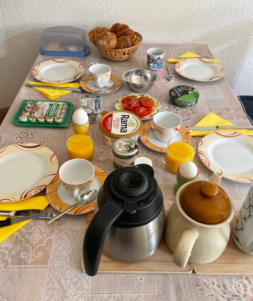 Gemeinsam mit meinen Eltern saßen L und ich kurz nach neun Uhr am liebevoll gedeckten Frühstückstisch. Neben meinem geliebten Schokocappuccino gab es auch ein leckeres Croissant.