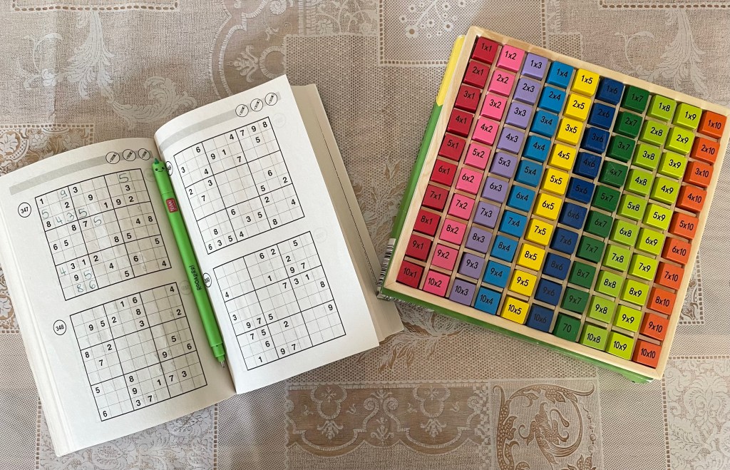Nach dem Essen träumte ich beim Lösen einiger Sudoku-Rätsel vor mich hin. L durfte etwas auf ihrem iPad gucken, ließ sich aber auch überreden, einige Aufgaben mit dieser tollen Multiplikationstafel, die uns ihre Schulfreundin EB ausgeliehen hat, zu üben.