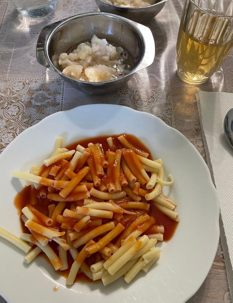 Zum Frühstück gab es Beeren-Schokomüsli mit der letzten verbliebenen Erdbeere, einer Banane und Pflanzenmilch, mittags aßen wir eine kleine Brotzeit und als sehr frühes Abendessen gab es Nudeln mit Tomatensoße.