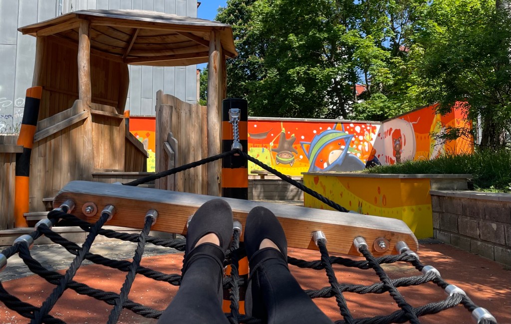 Meine Eltern machten sich direkt auf den Weg in die Wohnung. L und ich blieben noch eine Dreiviertelstunde auf dem Spielplatz. Abwechselnd stellten wir uns Parcours-Aufgaben, welche die andere nachmachen sollte. Ich genoss zwischendurch die warmen Sonnenstrahlen und entspannte kurz auf der Netzhängematte. Als wir zu meinen Eltern zurückkehrten, war gerade mein Bruder am Telefon, mit dem ich ebenfalls noch ein paar Minuten sprechen konnte.