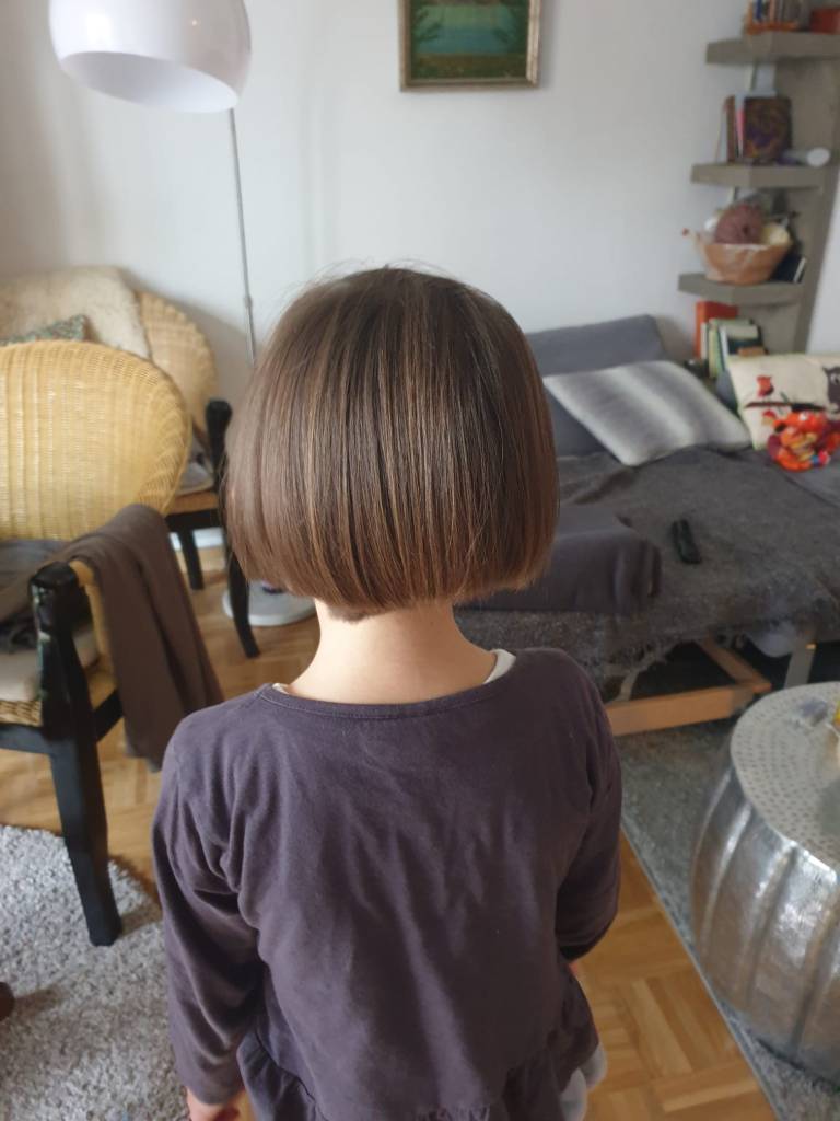 Während unseres längeren Erfurt-Aufenthaltes war es schließlich soweit: Gemeinsam mit ihrer Oma M ging sie zum Friseur und ließ sich ihre Haare um etwa zwanzig Zentimeter kürzen und eine schicke modische Frisur verpassen.