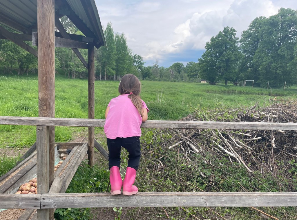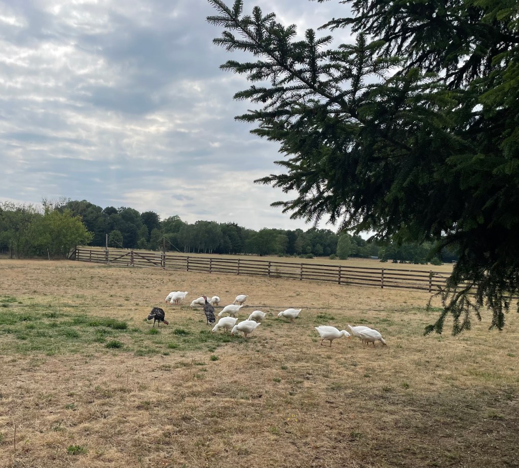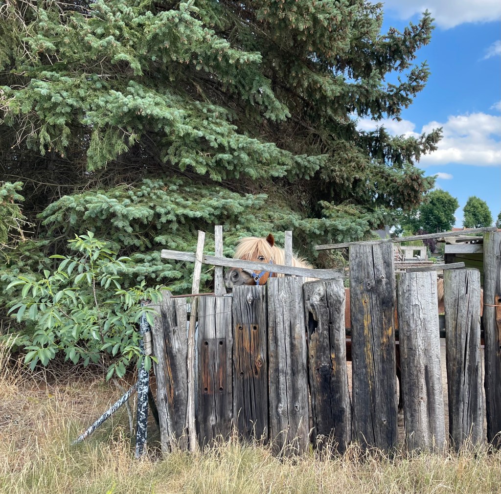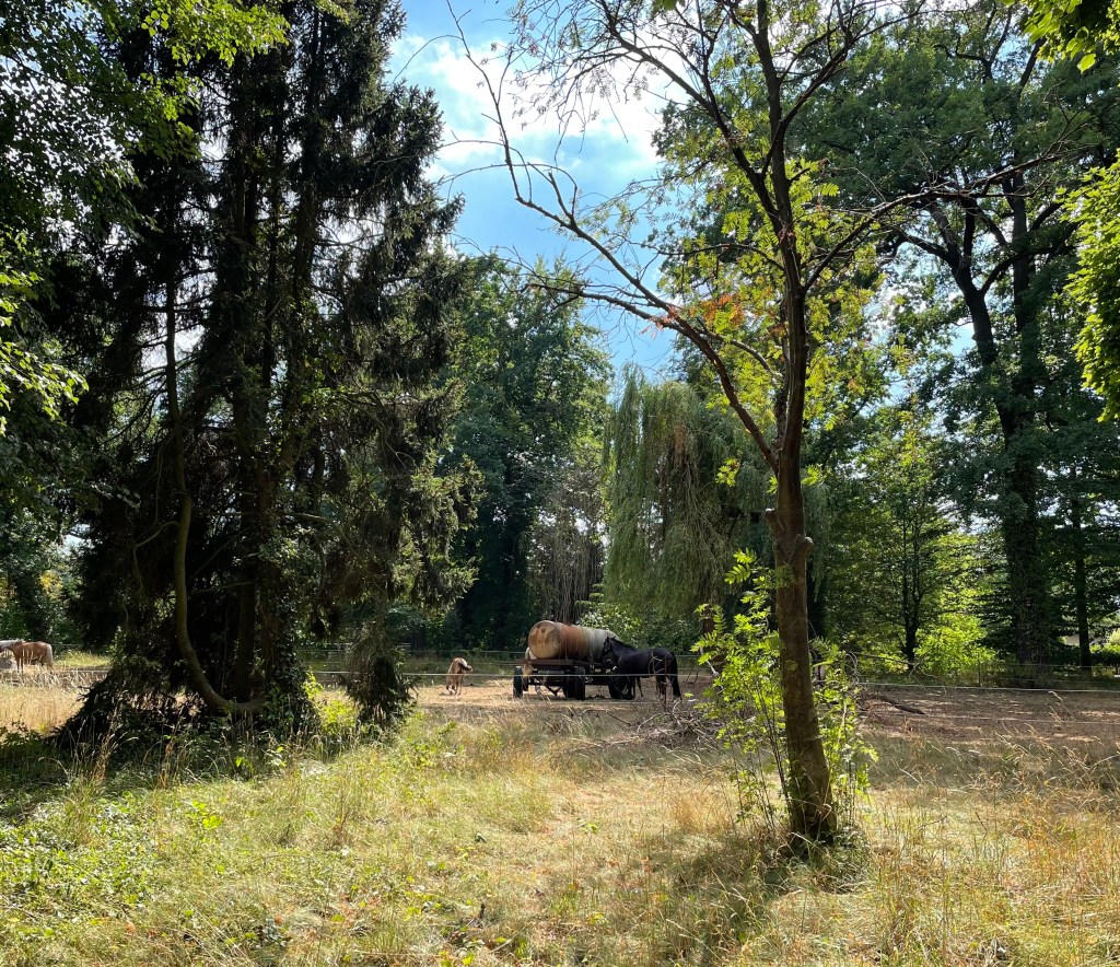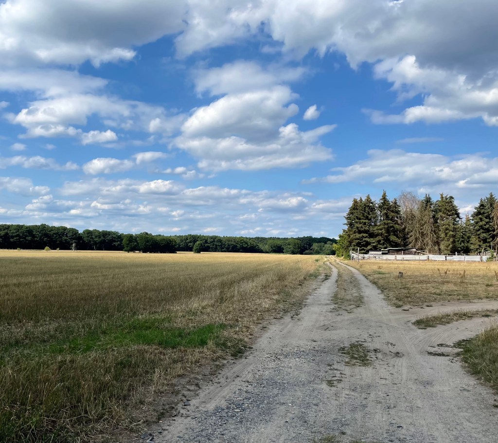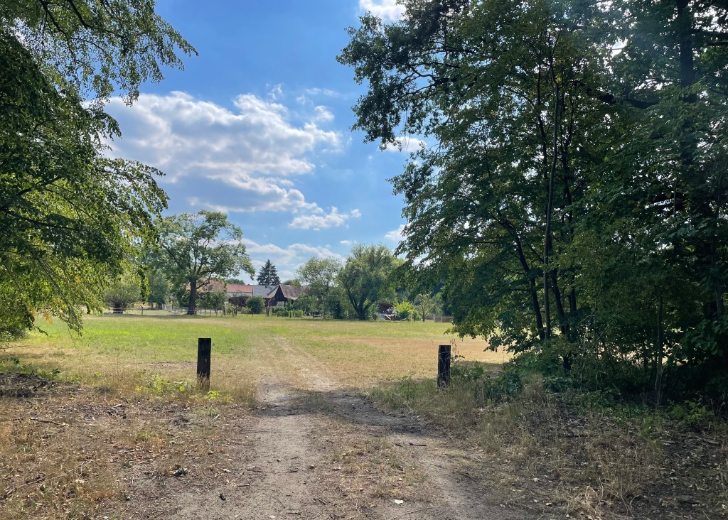 Nachdem wir zwei weitere Male im Pool badeten, begleitete L mich mit ihrem Roller auf einen Abendspaziergang. Wir stellten fest, dass nur wenige Häuser entfernt zwei Ponys wohnen, und sahen zahlreiche Pferde und Schmetterlinge. (Ich hoffe noch darauf, Hasen und Rehe zu sehen, denn viele Felder mit Waldgebieten liegen unmittelbar vor der Haustür.) Es ist ruhig. Hier ist unendlich viel Platz. Jedes Grundstück ist riesengroß und überall weiden Pferde. Ich glaube, es lebt sich hier in Brandenburg sehr angenehm.