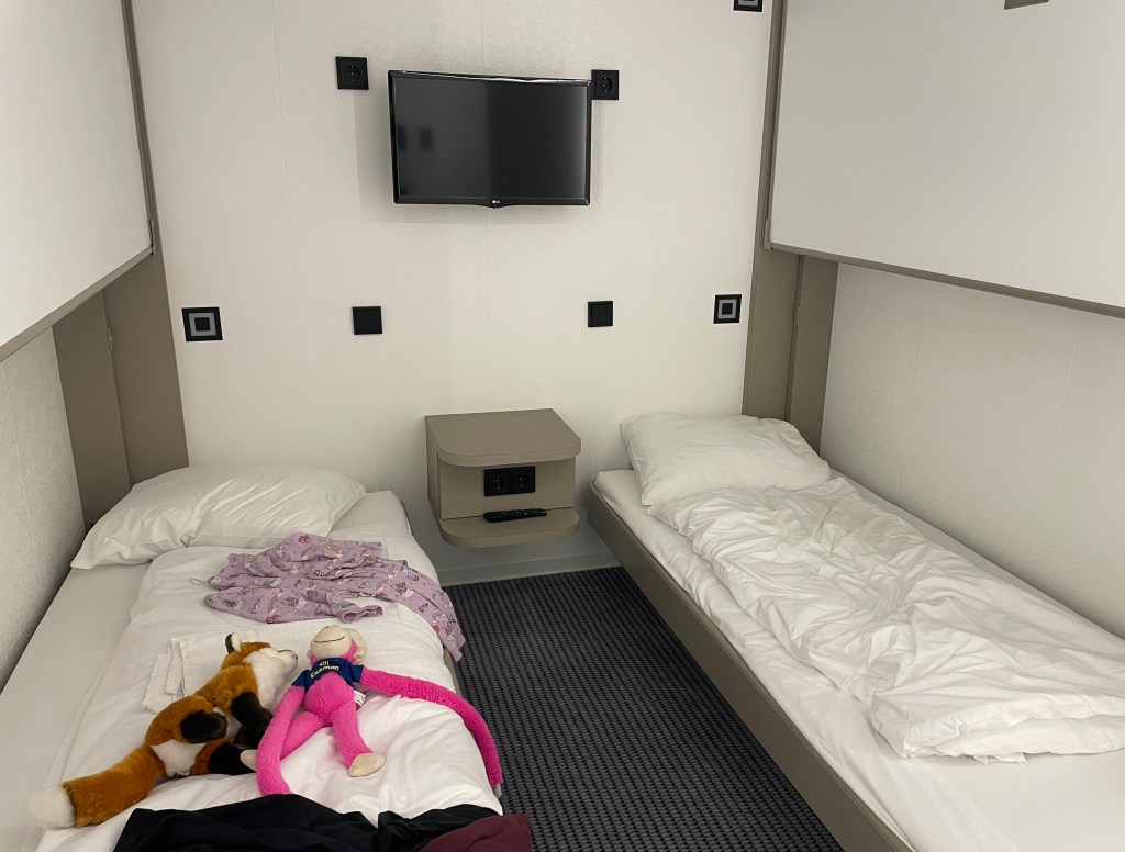 Nach dem Abendessen machten L und ich uns allmählich bettfertig. Wir lasen noch drei Kapitel aus dem Conni-Buch „Das tanzende Pony“ vor. In der Theorie wollte ich anschließend in meinem Buch weiterlesen, sobald das Licht ausgeschaltet wurde. In der Realität saß ein weinendes Kind auf dem Bettrand und brüllte eine Dreiviertelstunde wie am Spieß, weil unsere beiden Betten ungefähr dreißig Zentimeter auseinander standen und sie nicht in meinem Bett, das viel zu klein für zwei Personen ist, schlafen durfte. Ich las dennoch in meinem Buch, wenn auch nicht so entspannt wie erhofft. Erst meine Androhung, dass wir umgehend nach Hause fahren, wenn hier nicht bald Ruhe einkehrt, brachte L dazu, sich in ihr Bett zu legen und einzuschlafen. Es war inzwischen nach 22 Uhr.