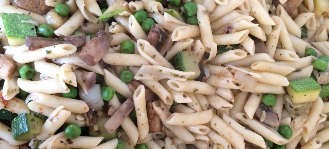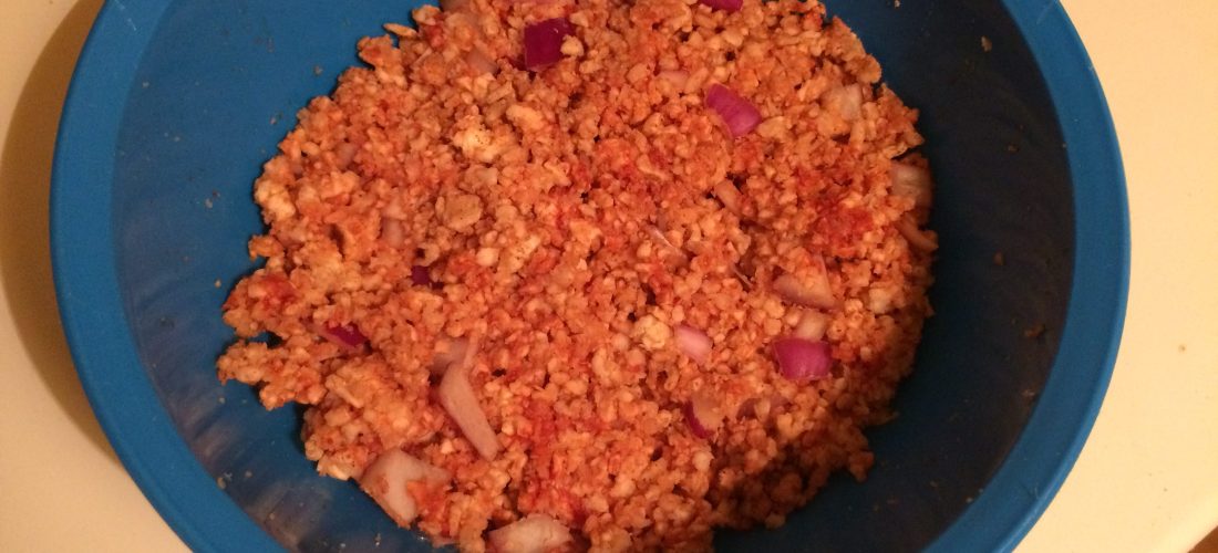 Die Füllung bestand aus wenigen Zutaten. Eine Zucchini sollte unbedingt mit enthalten sein. Da M und ich keinen Salat essen, wir aber noch Salatherzen von unseren Burgern vergangene Woche im Kühlschrank hatten und ich in diesem Jahr besonders darauf achten will, kein Essen wegzuschmeißen, wurden auch diese Bestandteil der Füllung. Die beiden Zutaten wurden zusammen mit zwei roten Zwiebeln kleingeschnitten. In eine Pfanne gab ich etwas Olivenöl, briet Zucchini, Salatherzen und Zwiebeln kurz an und fügte veganes Hack hinzu. Die Füllung würzte ich mit Salz und Pfeffer.